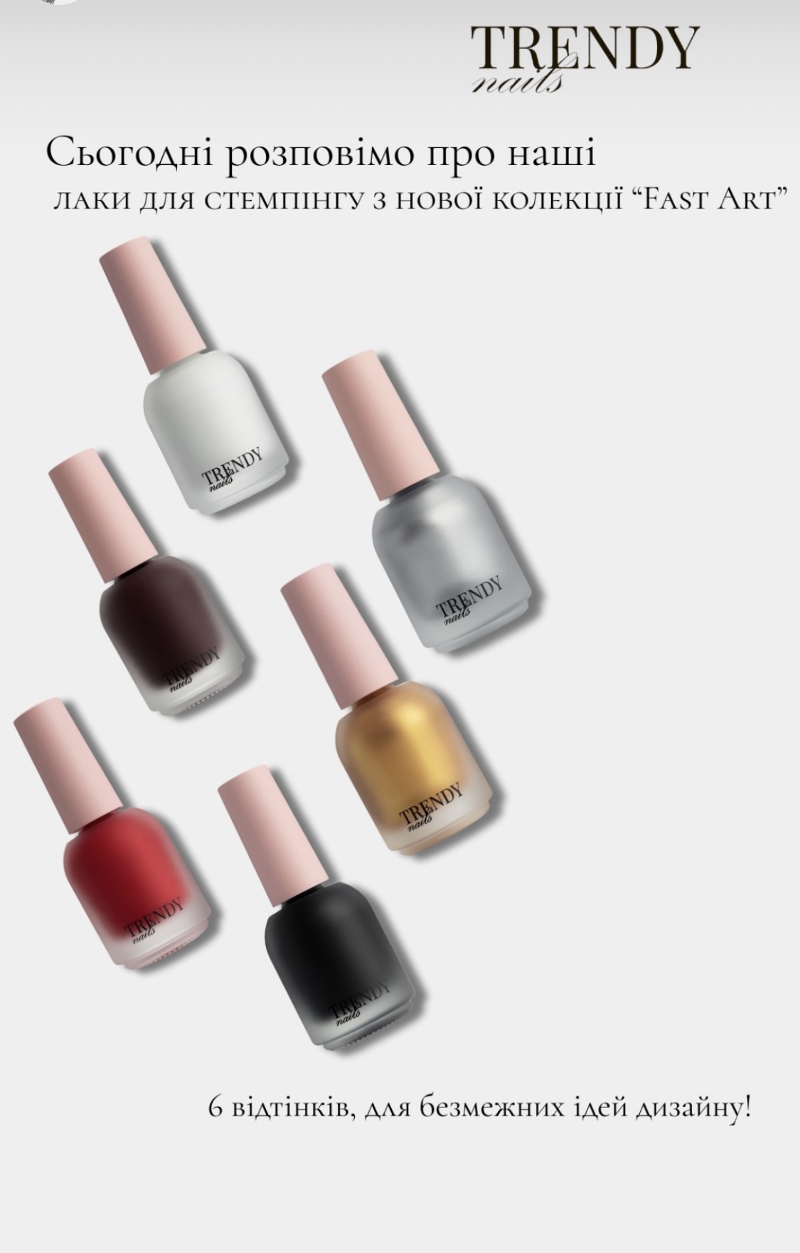 Лак за щамповане – пигментиран лак за създаване на линии с различна дебелина. Течната консистенция равномерно запълва гравюрата на плочата, ясно се пренася върху подложката за щамповане и нокътя. Препоръчително е да се премахне лепкавият слой преди нанасяне. Съхне на въздух (времето зависи от температурата в помещението). Цветове: бяло, черно, сребристо, златисто, яркочервено, кафяво.
