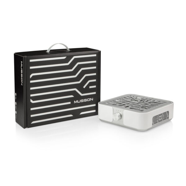 Професионален  прахоуловител MUSSON с въглероден HEPA филтър – ново ниво на технологии за маникюристи. Това е резултат от съвременни инженерни решения и дългогодишен опит на BUCOS, насочени към това да направят работата на професионалиста максимално комфортна и безопасна. MUSSON съчетава висока всмукателна мощност и  тиха работа. Благодарение на модерен мотор и 20% по-голям диаметър на вентилатора, радиусът на абсорбиране на прах е станал по-голям, а всмукателната мощност се е увеличила със 70%.