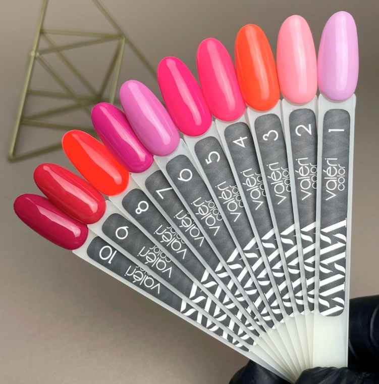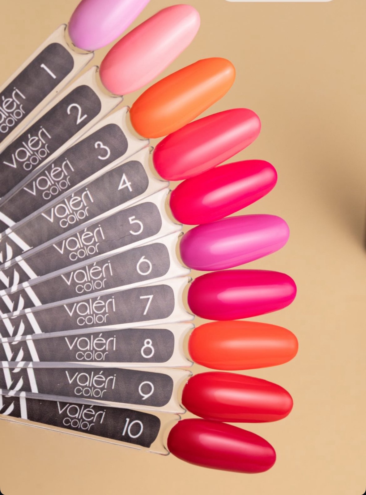 Гел лаковете на Valeri са висококачествени, пигментирани гел лакове, които се нанасят гладко и втвърдяват под лампа. С правилната техника на нанасяне повечето цветове могат да бъдат покрити в един слой. Имат отлична консистенция със средна плътност, която не им позволява да се стичат върху кутикулата и страничните стени. Силно пигментирани, те не се разпръскват и се разпределят равномерно по нокътната плочка. Предлага се в рентабилни обеми, позволяващи разнообразна цветова палитра. Една бутилка гел лак е достатъчна за 18-20 нанасяния.