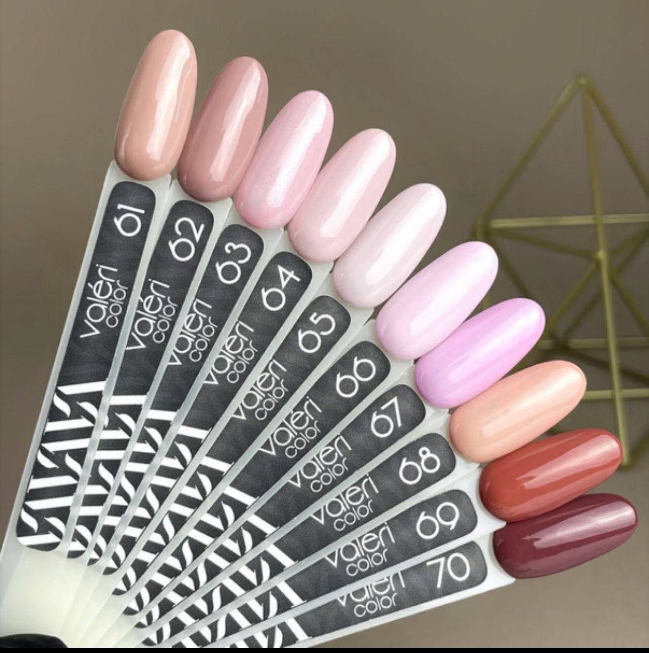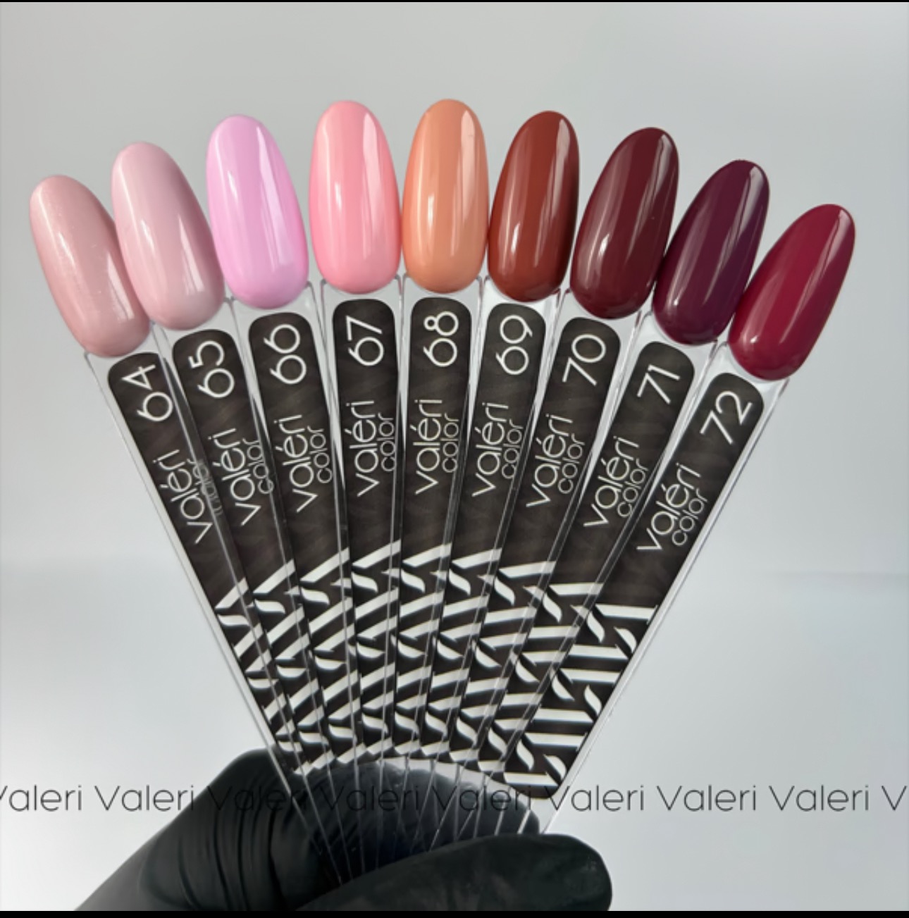 Гел лаковете на Valeri са висококачествени, пигментирани гел лакове, които се нанасят гладко и втвърдяват под лампа. С правилната техника на нанасяне повечето цветове могат да бъдат покрити в един слой. Имат отлична консистенция със средна плътност, която не им позволява да се стичат върху кутикулата и страничните стени. Силно пигментирани, те не се разпръскват и се разпределят равномерно по нокътната плочка. Предлага се в рентабилни обеми, позволяващи разнообразна цветова палитра. Една бутилка гел лак е достатъчна за 18-20 нанасяния.
