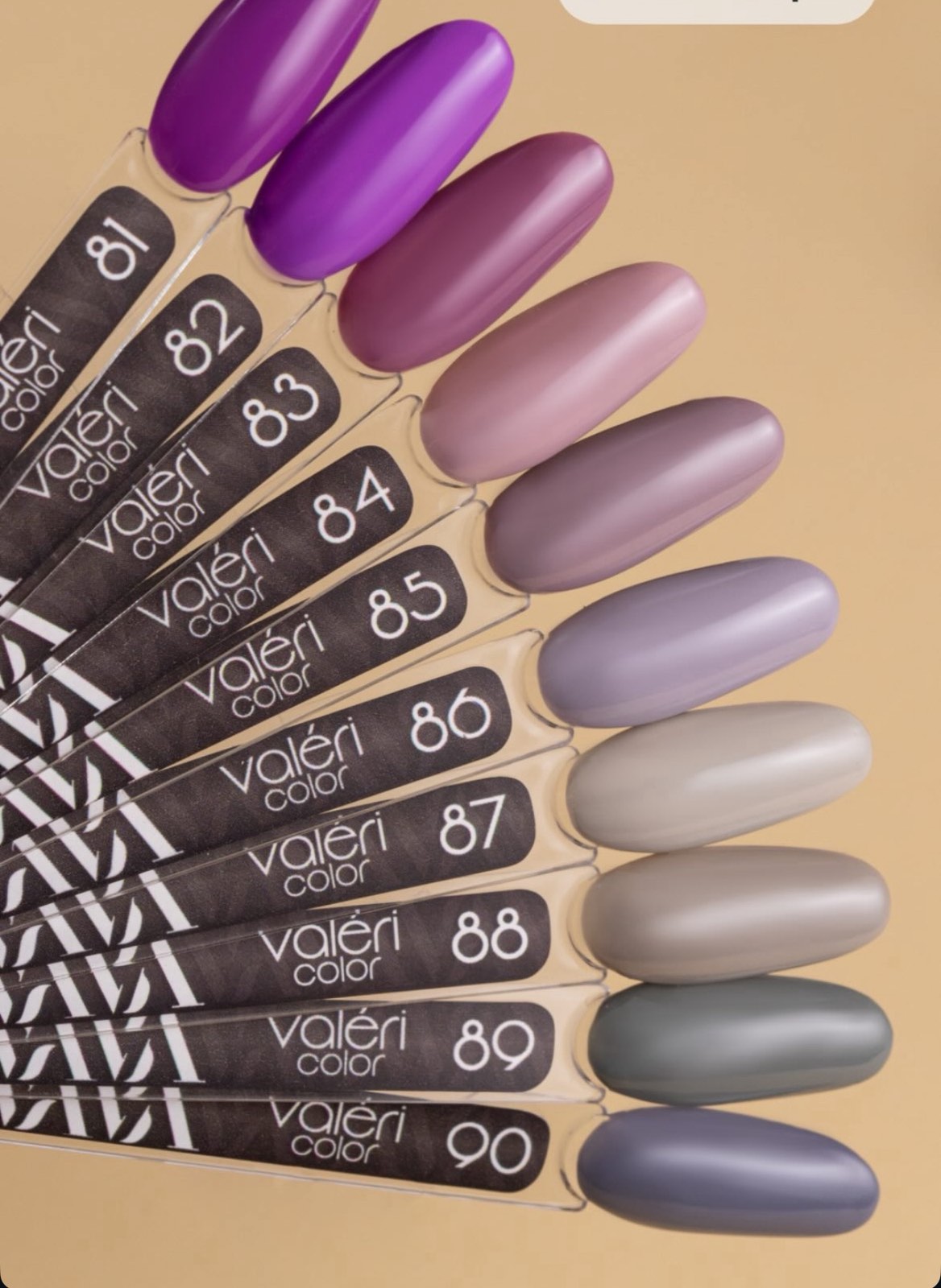 Гел лаковете на Valeri са висококачествени, пигментирани гел лакове, които се нанасят гладко и втвърдяват под лампа. С правилната техника на нанасяне повечето цветове могат да бъдат покрити в един слой. Имат отлична консистенция със средна плътност, която не им позволява да се стичат върху кутикулата и страничните стени. Силно пигментирани, те не се разпръскват и се разпределят равномерно по нокътната плочка. Предлага се в рентабилни обеми, позволяващи разнообразна цветова палитра. Една бутилка гел лак е достатъчна за 18-20 нанасяния.