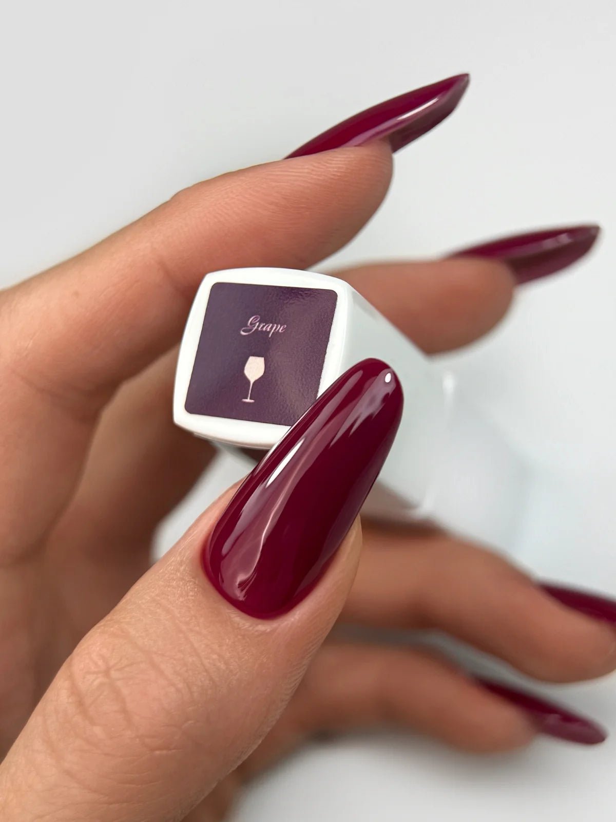Ярко лилаво, вдъхновено от живите нюанси на прясно набрано грозде. Grape е полуперманентен лак, който съчетава модерност и чар, идеален за оригинални и изискани визии. Средно гъстата текстура осигурява прецизно нанасяне без разтичане и незабавно покритие. Ярък и дълготраен, той запазва интензитета на цвета до 4 седмици. Формулата не съдържа HEMA, Di-HEMA и TPO , което го прави нежен към ноктите.