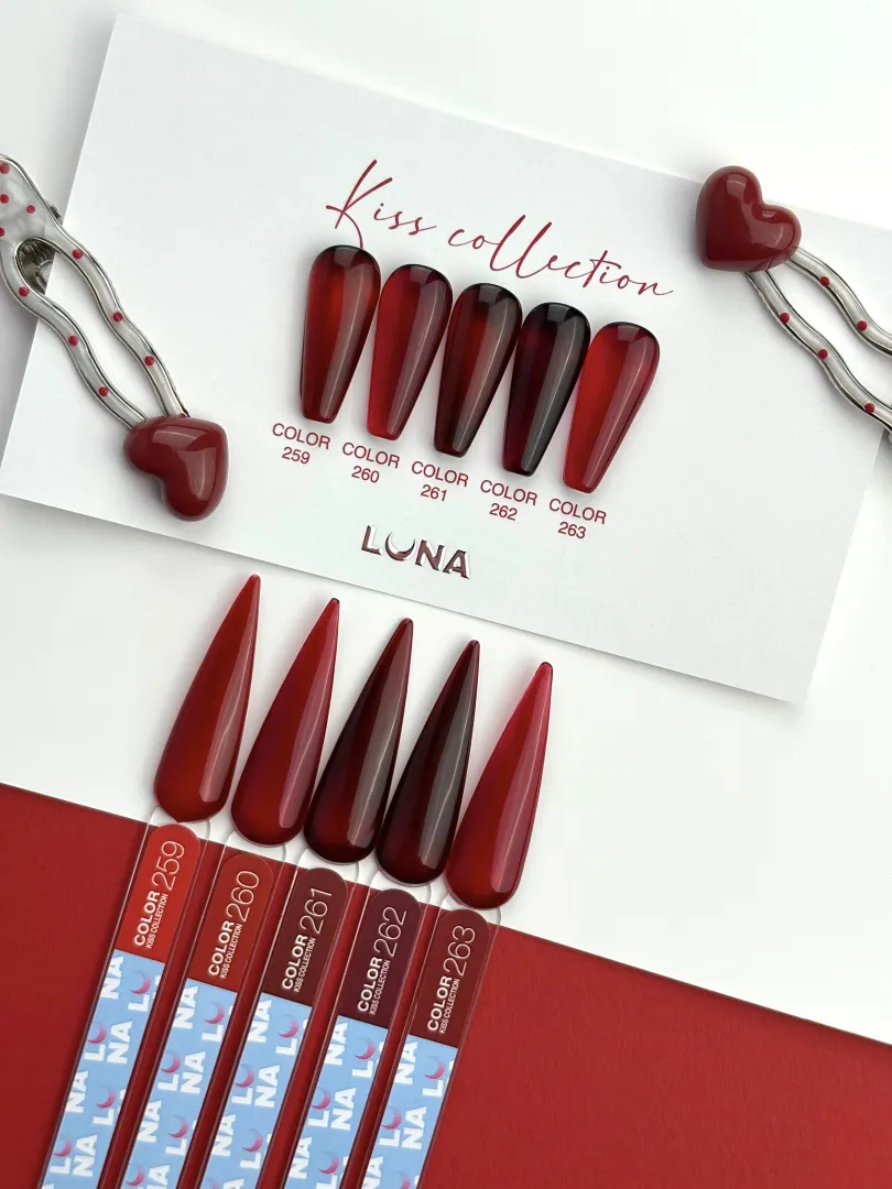 KISS COLLECTION е колекция от 5 гел лака (цветове 259-263) с полупрозрачна витражна основа. Всеки гел лак от колекцията пленява с дълбокия си нюанс и витражен ефект на финала. От червено до наситено бордо – задължителните нюанси в палитрата на професионалистите.