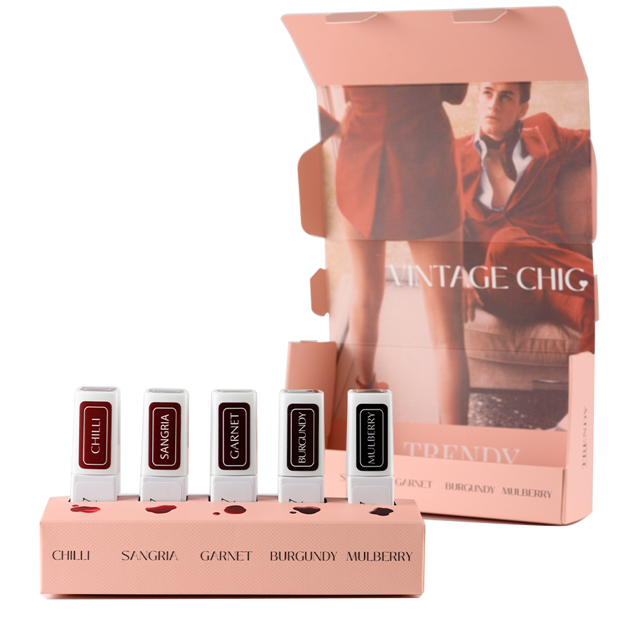 Колекцията Vintage Chic е селекция от 5 червени гел лака , които напомнят за елегантността на 50-те години. Всеки нюанс олицетворява жена, варираща от аристократична изтънченост до дръзка провокация.