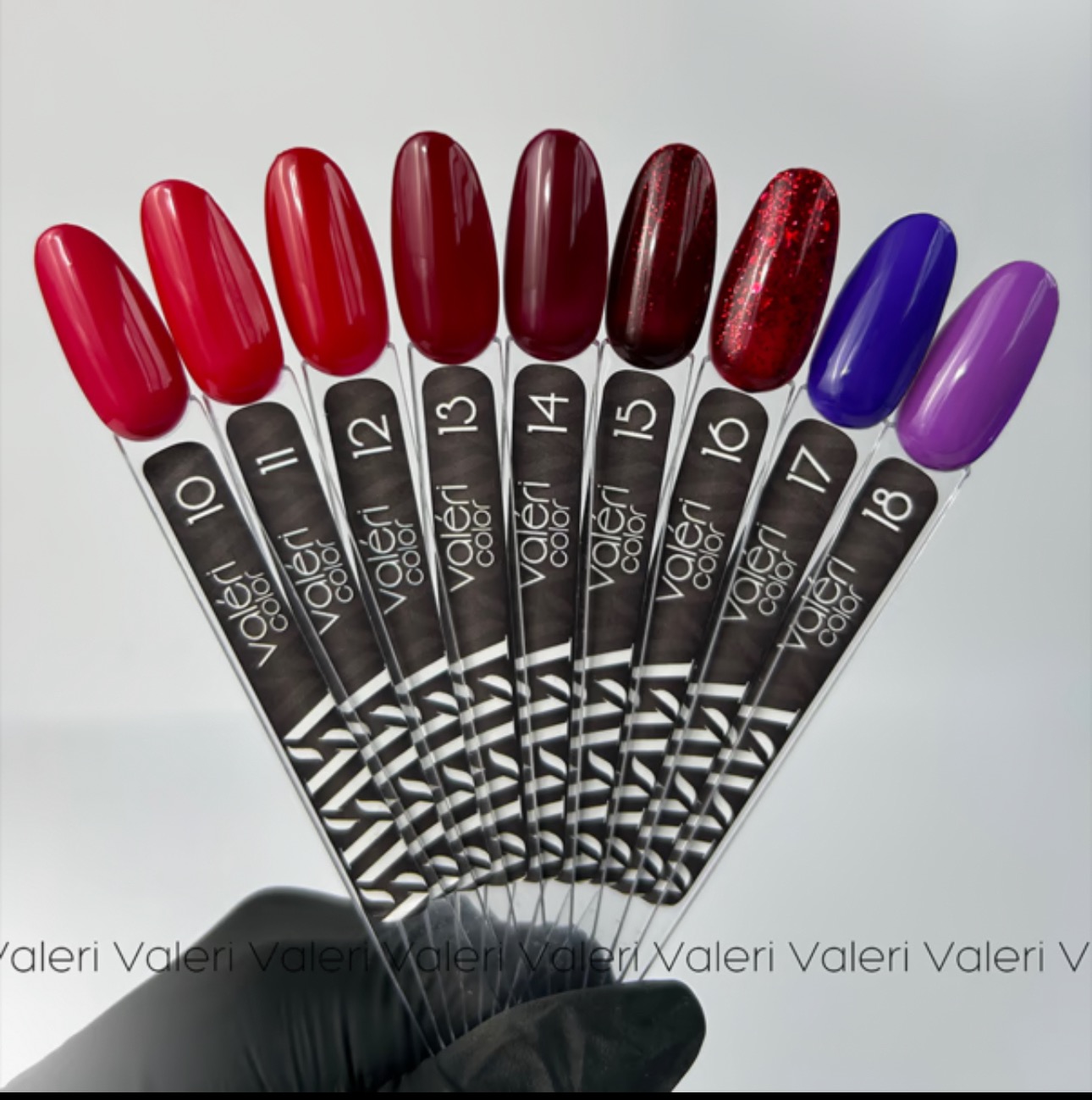 Гел лаковете на Valeri са висококачествени, пигментирани гел лакове, които се нанасят гладко и втвърдяват под лампа. С правилната техника на нанасяне повечето цветове могат да бъдат покрити в един слой. Имат отлична консистенция със средна плътност, която не им позволява да се стичат върху кутикулата и страничните стени. Силно пигментирани, те не се разпръскват и се разпределят равномерно по нокътната плочка. Предлага се в рентабилни обеми, позволяващи разнообразна цветова палитра. Една бутилка гел лак е достатъчна за 18-20 нанасяния.