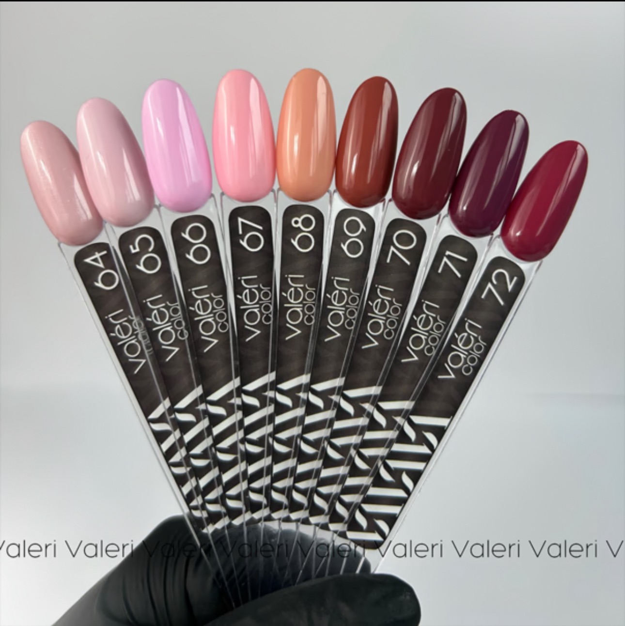 Гел лаковете на Valeri са висококачествени, пигментирани гел лакове, които се нанасят гладко и втвърдяват под лампа. С правилната техника на нанасяне повечето цветове могат да бъдат покрити в един слой. Имат отлична консистенция със средна плътност, която не им позволява да се стичат върху кутикулата и страничните стени. Силно пигментирани, те не се разпръскват и се разпределят равномерно по нокътната плочка. Предлага се в рентабилни обеми, позволяващи разнообразна цветова палитра. Една бутилка гел лак е достатъчна за 18-20 нанасяния.