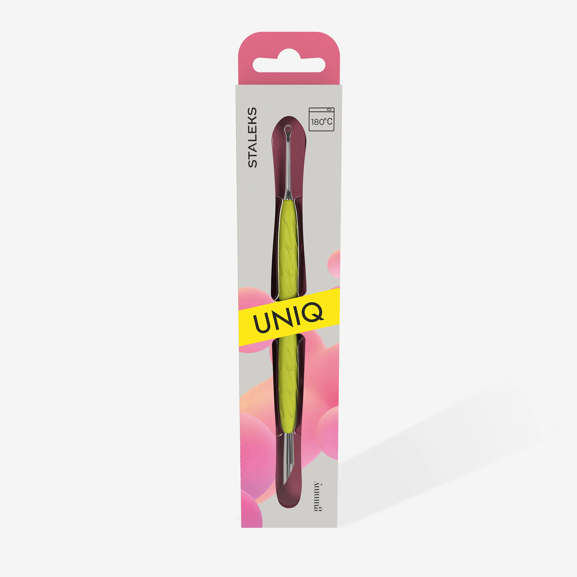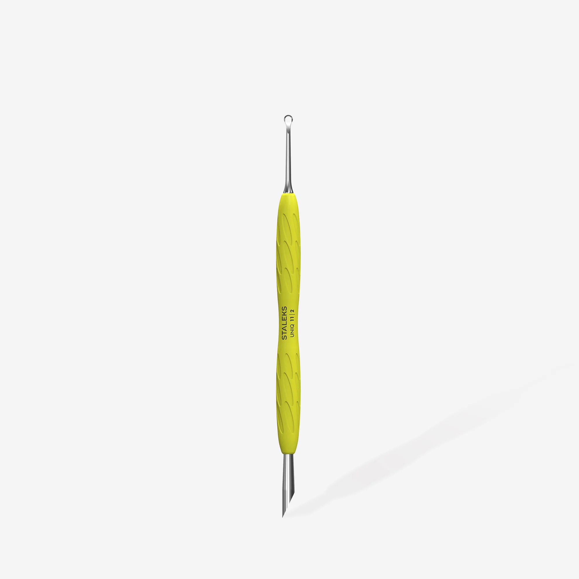 STALEKS GUMMY избутвач – PQ-11/2Y е професионален инструмент от висок клас, създаден за прецизна грижа за кутикулите при маникюр и педикюр. Благодарение на специално проектираната форма, инструментът се адаптира перфектно към нокътната плочка, което позволява лесно и ефективно избутване на кутикулите без риск от нараняване.