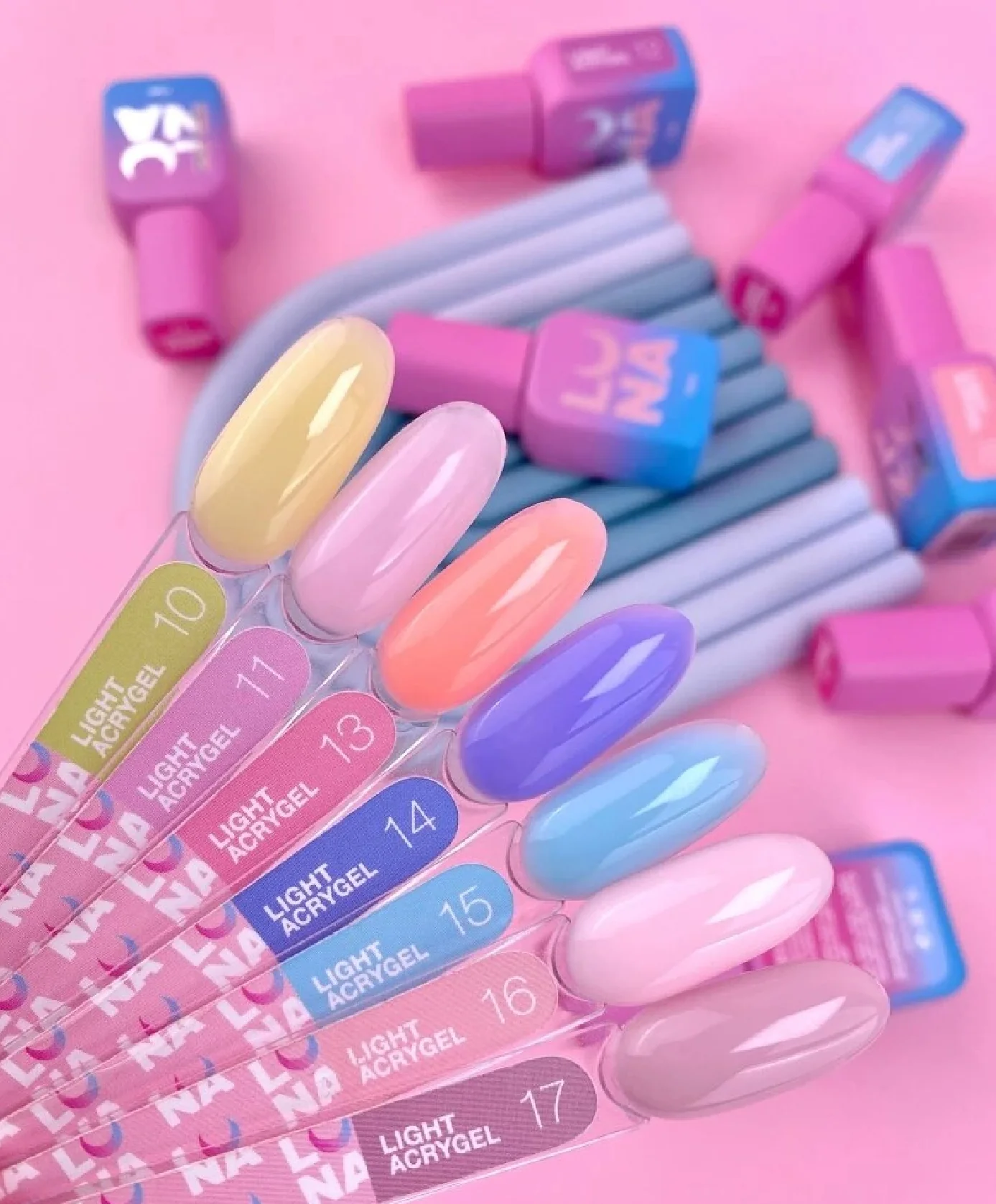 Lunamoon Liquid Light Acrygel е иновативен материал за укрепване, изравняване и удължаване на ноктите.  Той е хибрид от полигел и база, състоящ се от  60–80% акрилен съполимер  и  20–30% HEMA . Може напълно да замени базовия слой при моделиране на ноктите.