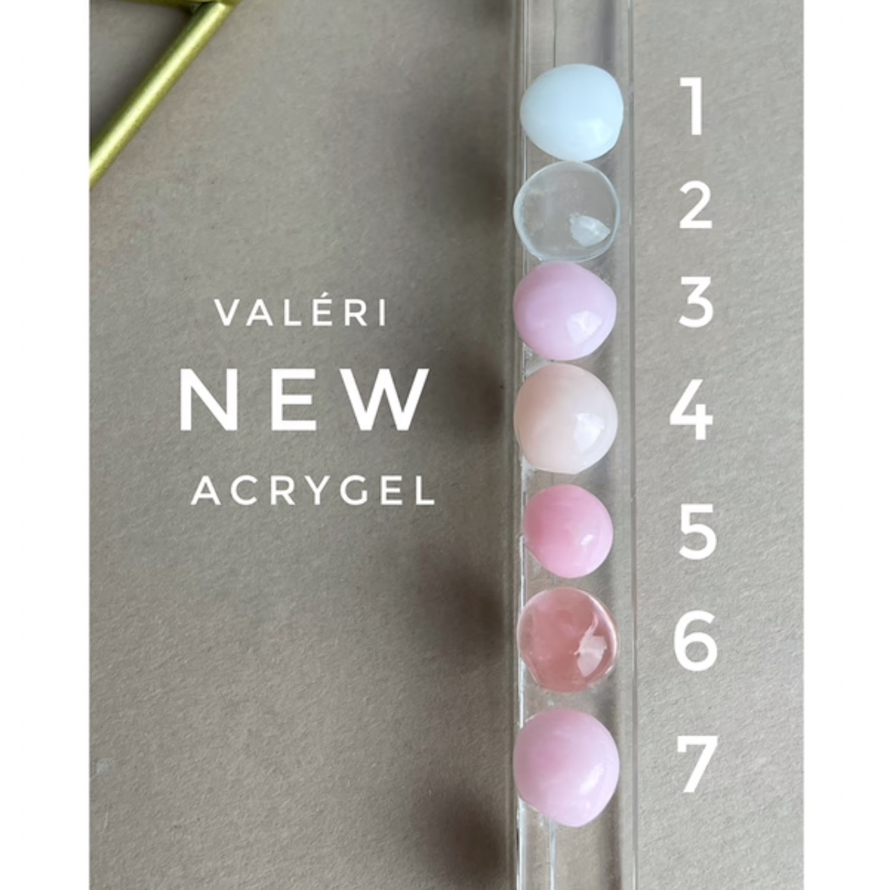 Колекцията Valeri Acryl Gel е набор от седем акрилни гела (полигели) в най-популярните нюанси, предназначени както за удължаване на ноктите, така и за корекция, възстановяване или укрепване на нокътните плочки. Тези акрилни гелове са нискотемпературни, финозърнести, твърди, гъвкави при нанасяне и плътна консистенция. Не предизвикват усещане за парене под лампата и са силно пигментирани. Лесни за нанасяне и поддържане на нокътната дъга, идеални са както за горни, така и за долни форми, удължаване на ъглите или коригиране на деформации на нокътната плочка. Цялата колекция е подходяща за създаване на елегантен френски дизайн. Геловете се пилят лесно.
