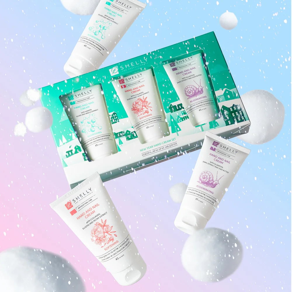 Подарете на кожата си влага и нежност с новогодишния комплект кремове за ръце от Shelly! Комплектът включва три продукта: подхранващ крем с кератин, сребро и екстракт от арника; омекотяващ крем с колаген, еластин и екстракт от божур; регенериращ крем с алантоин, екстракт от охлюв и масло от ший. Кремовете имат лека консистенция и бързо попиват. Оптималният състав от хранителни вещества спомага за поддържането на епидермиса в здраво и добре поддържано състояние.
