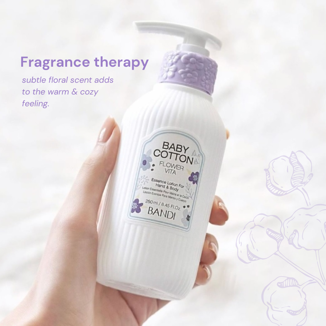 Потопете се в нежната прегръдка на комфорт и нежност с нашия лосион за ръце и тяло Flower Vita, деликатно влят с успокояващата есенция на Baby Cotton. Изживейте меката, пудрена ароматна основа, която се преплита безпроблемно с фин флорален букет, създавайки аура на топлина и уют, която повдига сетивата.