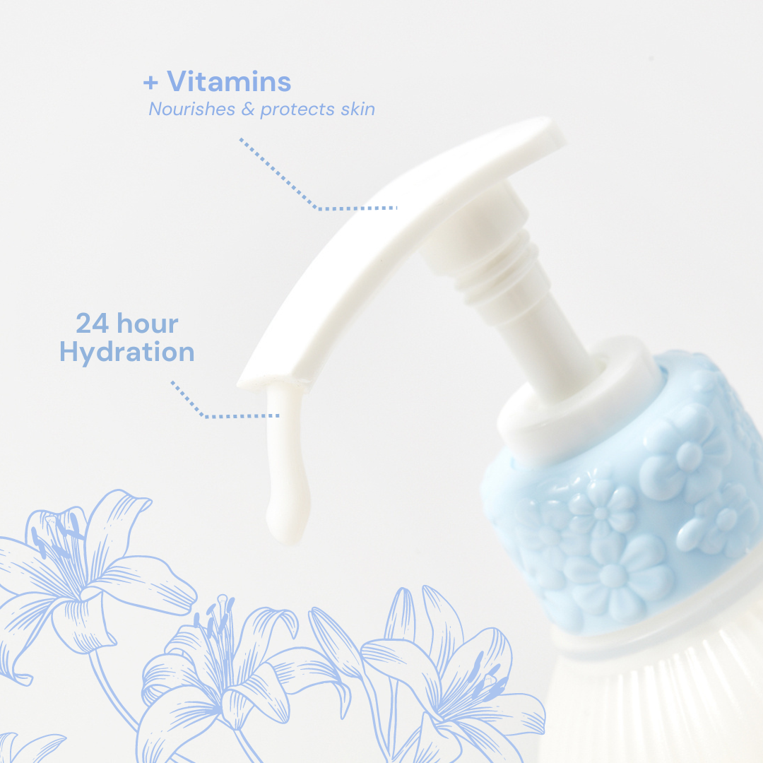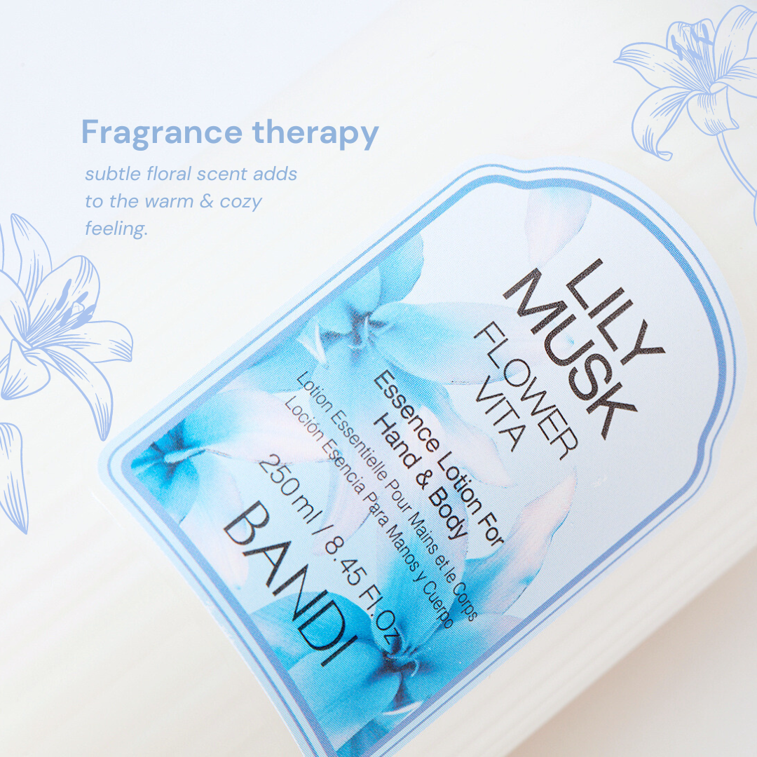 Потопете се в хармоничната смес от вечна елегантност и успокояваща топлина с нашия лосион за ръце и тяло Flower Vita с пленителен аромат на Лилия Мускус. Потопете се в естествено балансираната комбинация от грациозна лилия и примамливи аромати на мускус, създавайки изискан букет, който успокоява и съблазнява сетивата.