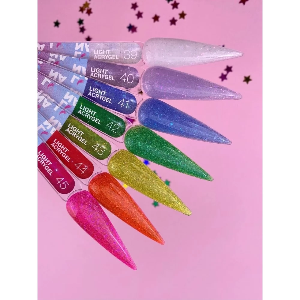 Light Acrygel е симбиоза от полигел и основа. Състои се от повече от половината (60-80%) акрилен съполимер, основният компонент на полигела, и малко количество хидроксиетилметакрилат HEMA (около 20-30%), основният компонент на базовите покрития.