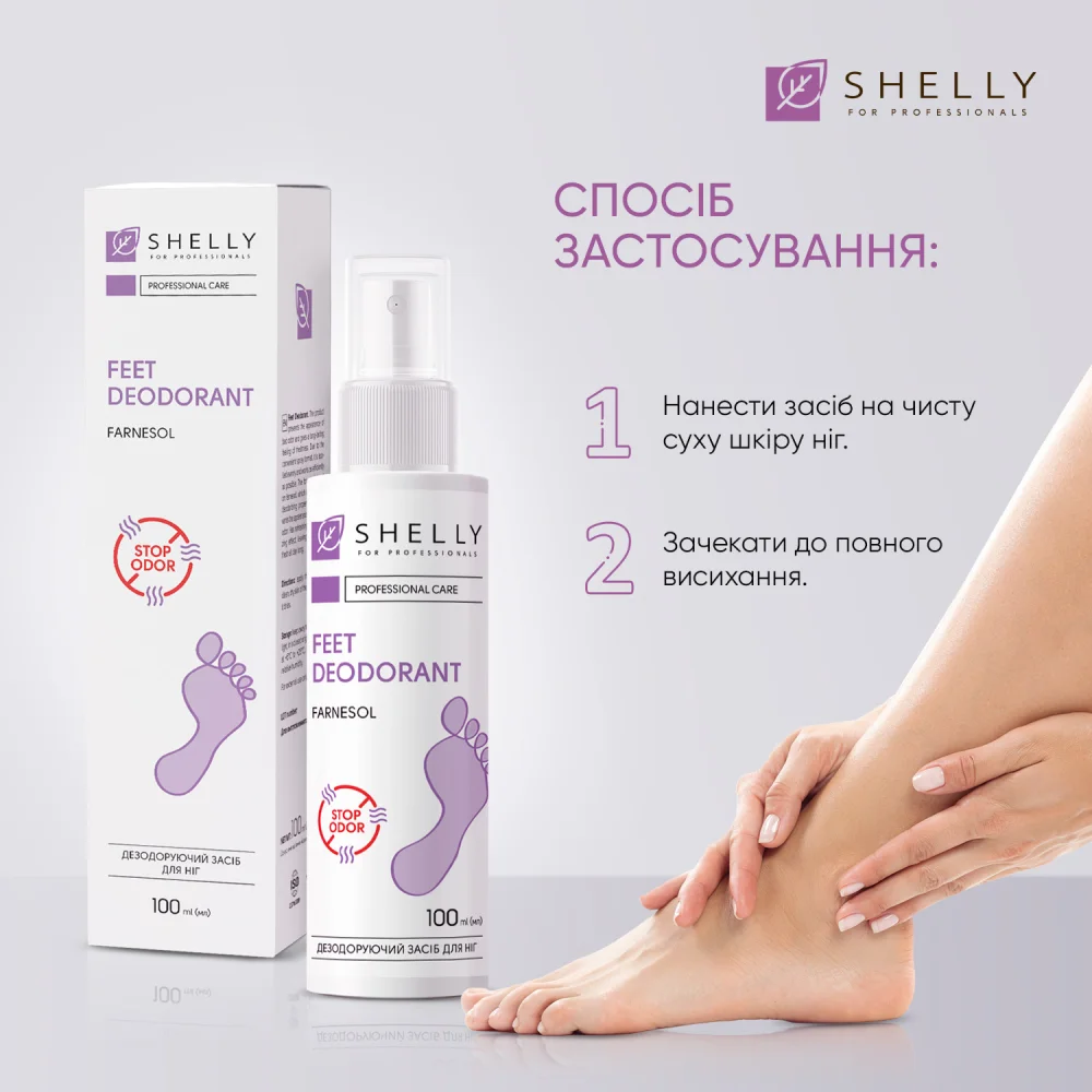 Професионалният продукт Shelly™ е предназначен за крака с прекомерно изпотяване. Спреят предотвратява появата на неприятна миризма, поддържа оптимално ниво на изпотяване, има изразен дезодориращ и противогъбичен ефект. Предотвратява появата и размножаването на патогенни микроорганизми и бактерии. Позволява бързо и ефективно освежаване на кожата на краката, оставяйки я суха, като същевременно е максимално хидратирана. Формулата на продукта е базирана на фарнезол, който елиминира неприятната миризма, контролира и регулира производството на секрети. Притежава изразени дезинфекциращи свойства, ефективно инхибира и блокира активността на бактериите, нормализира процесите на отстраняване на излишната влага от тялото. Алантоинът омекотява и овлажнява епидермиса, стимулира регенеративните процеси в клетките на кожата, в резултат на което тя се възстановява и става добре поддържана. Спреят е подходящ за ежедневна грижа.